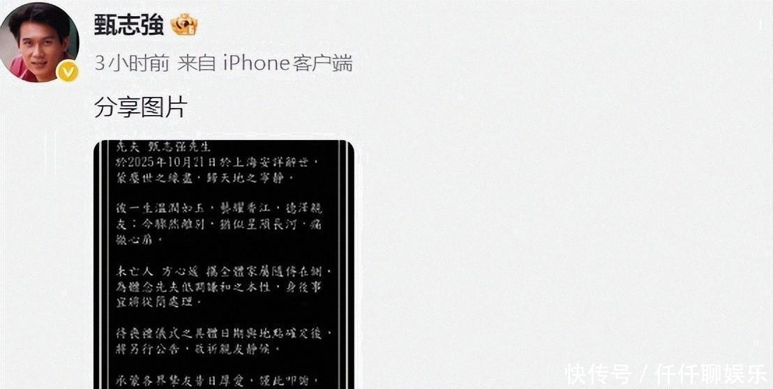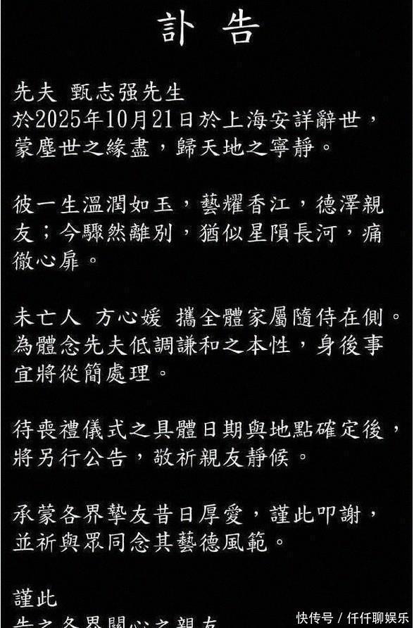 10月21日,59岁的甄志强在上海突发心脏事件,经抢救无效去世10月31日,妻子心媛发布讣告,确认他在上海离世的消息讣告表示尊重其生前低调的性格,身后事一切从简,丧礼日期与地点待定
